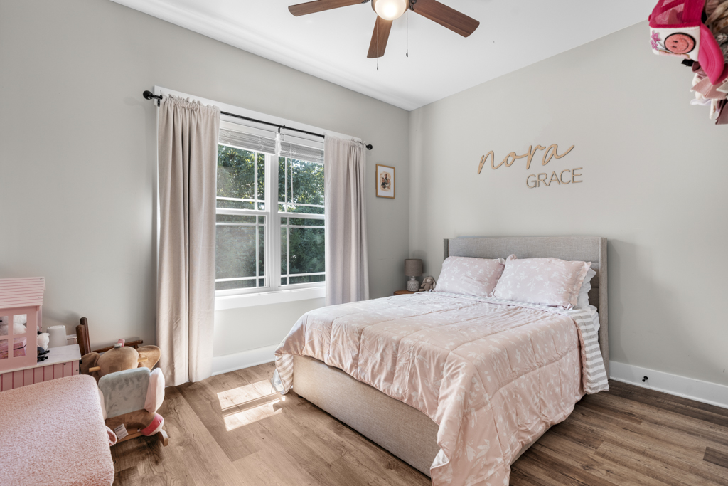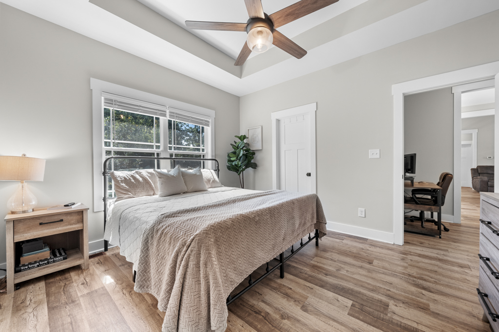 The bedroom should evoke a sense of peace and comfort. Use a wide-angle shot to capture the entire space, highlighting its cozy and relaxing atmosphere.